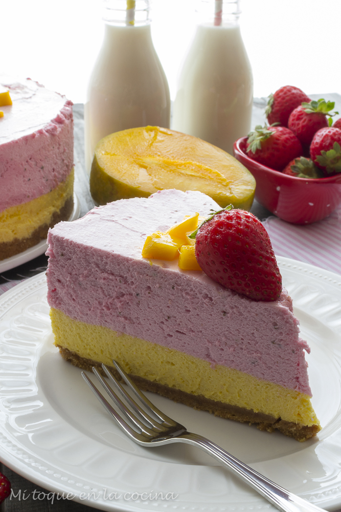 Sacamos el molde de la nevera y rellenamos con la mousse de fresa. Volvemos a alisar la parte superior de la tarta y la llevamos a la nevera otras cuatro horas. Yo la dejo toda la noche. Un momento antes de servir podemos decorar la tarta con trocitos de mango y fresas. Ya tenemos una delicia con la que sorprender en casa.